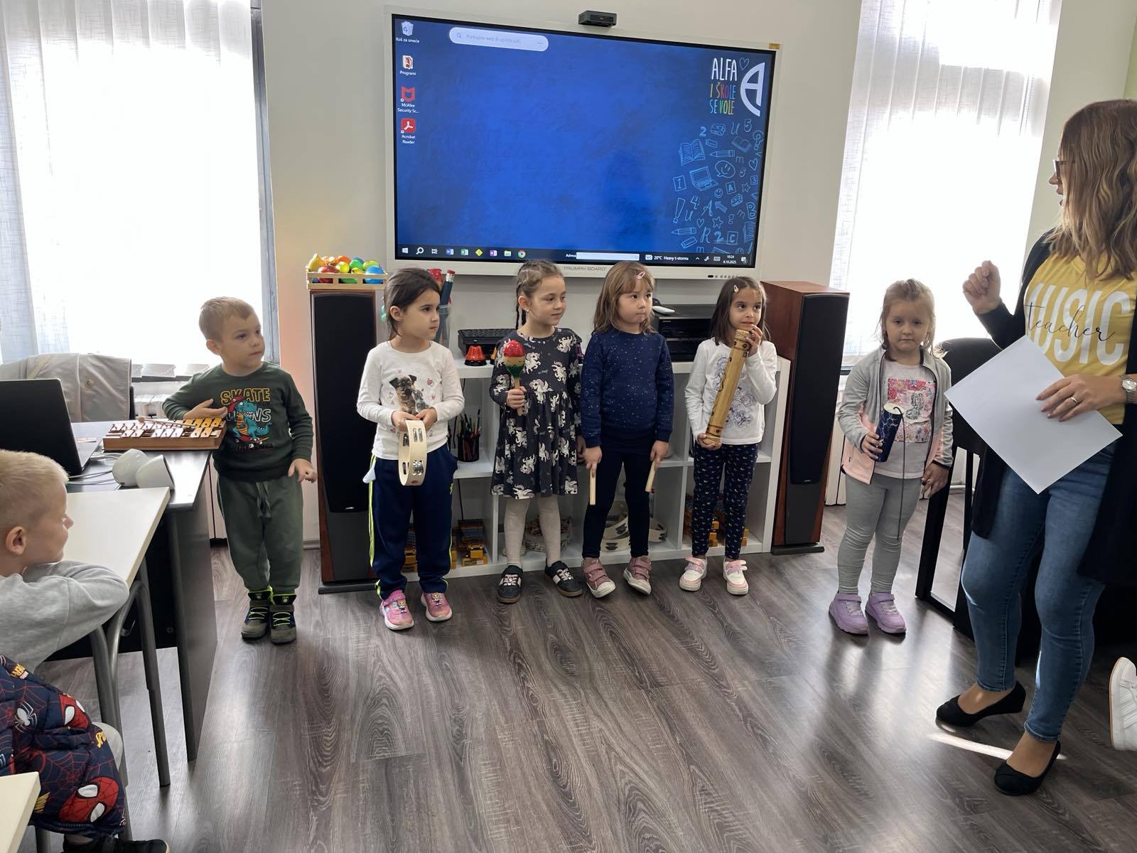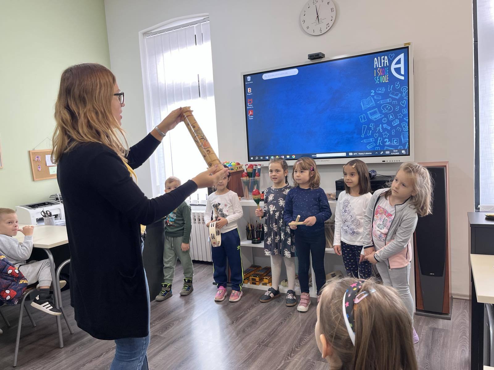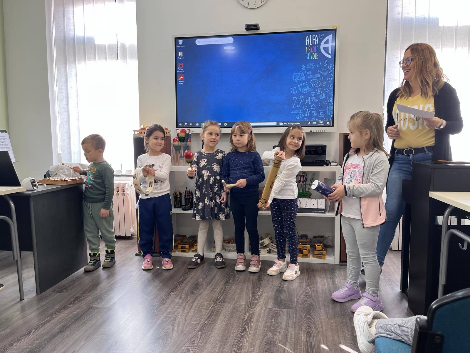 U svijet glazbe i zvukova mali su gosti zakoračili sviranjem raznih udaraljki, prateći ritmove koje je izvodila učiteljica. Nakon glazbene igre uslijedila je priča „Zvučna šuma“, u kojoj su se izmjenjivali zvukovi životinja, kiše i munje, a djeca su ih oponašala pomoću instrumenata.